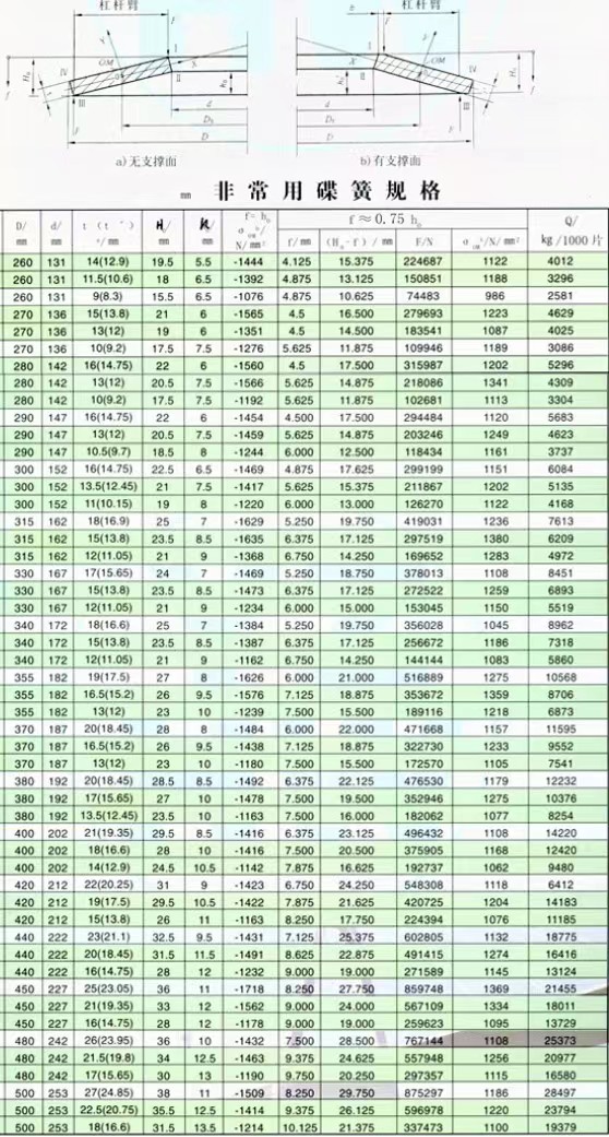碟形彈簧成圓錐形盤狀,作為密封輔助件,既可以單個使用,又可以多個串聯(lián)或并聯(lián)使用,在上內(nèi)緣和下外緣處承受沿軸向作用的靜態(tài)或動態(tài)載荷(見相冊),被壓縮后產(chǎn)生變形,直至被壓平,以儲存能量形式作為活載荷,在必要時自動轉(zhuǎn)化為密封所需要的附加壓縮載荷,來降低墊片、填料使用中對上緊的持續(xù)要求,減少不必要的停機(jī)維修時間和泄漏損失。